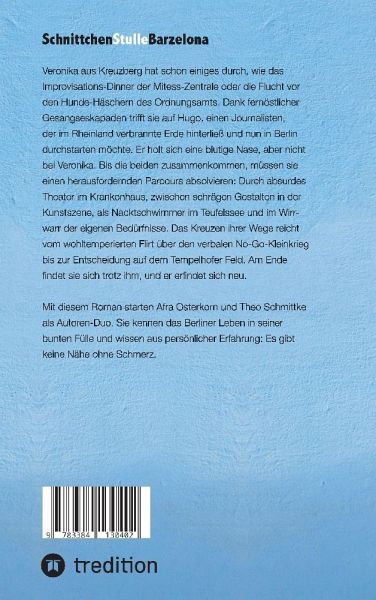 Veronika aus Kreuzberg hat schon einiges durch, wie das Improvisations-Dinner der Mitess-Zentrale oder die Flucht vor den Hunde-Häschern des Ordnungsamts. Dank fernöstlicher Gesangseskapaden trifft sie auf Hugo, einen Journalisten, der im Rheinland verbrannte Erde hinterließ und nun in Berlin durchstarten möchte. Er holt sich eine blutige Nase, aber nicht bei Veronika. Bis die beiden zusammenkommen, müssen sie einen herausfordernden Parcours absolvieren: Durch absurdes Theater im Krankenhaus, zwischen schrägen Gestalten in der Kunstszene, als Nacktschwimmer im Teufelssee und im Wirrwarr der eigenen Bedürfnisse. Das Kreuzen ihrer Wege reicht vom wohltemperierten Flirt über den verbalen No-Go-Kleinkrieg bis zur Entscheidung auf dem Tempelhofer Feld.