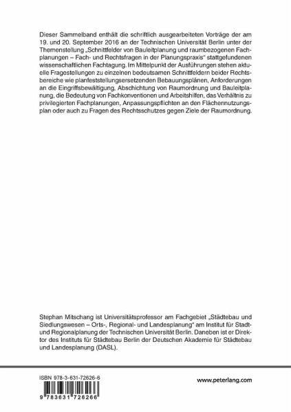 Dieser Sammelband enthält die schriftlich ausgearbeiteten Vorträge der am 19. und 20. September 2016 an der Technischen Universität Berlin unter der Themenstellung «Schnittfelder von Bauleitplanung und raumbezogenen Fachplanungen - Fach- und Rechtsfragen in der Planungspraxis» stattgefundenen wissenschaftlichen Fachtagung. Im Mittelpunkt der Ausführungen stehen aktuelle Fragestellungen zu einzelnen bedeutsamen Schnittfeldern beider Rechtsbereiche wie planfeststellungsersetzenden Bebauungsplänen, Anforderungen an die Eingriffsbewältigung, Abschichtung von Raumordnung und Bauleitplanung, die Bedeutung von Fachkonventionen und Arbeitshilfen, das Verhältnis zu privilegierten Fachplanungen, Anpassungspflichten an den Flächennutzungsplan oder auch zu Fragen des Rechtsschutzes gegen Ziele der Raumordnung.