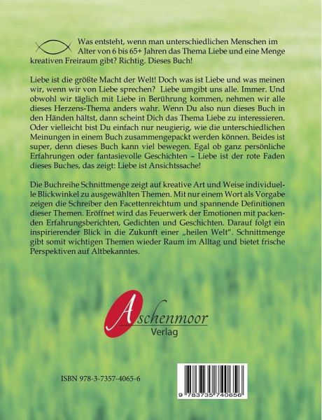 Liebe ist die größte Macht der Welt.Doch was ist Liebe und was meinen wir, wenn wir von Liebe sprechen?Liebe umgibt uns alle. Immer. Und obwohl wir täglich mit der Liebe in Berührung kommen, nehmen wir alle dieses Herzensthema anders wahr. Aber wie genau sieht jeder einzelne das Thema Liebe. Genau damit beschäftigt sich das Buch "Schnittmenge Liebe". Dieses Buch zeigt auf wundervolle Art, wie Kinder, Jugendliche, Erwachsene und Senioren das Thema Liebe wahrnehmen. Und das aus den verschiedensten Lebenslagen - Schulkind, Auszubildende, Studierende, Hausmann/-frau, Manager/-in oder ähnliches.Egal ob persönliche Erfahrungen, nachdenkliche Gedichte oder fantasievolle Geschichte - Liebe ist der rote Faden dieses Buches, das zeigt: - Liebe ist Ansichtssache -