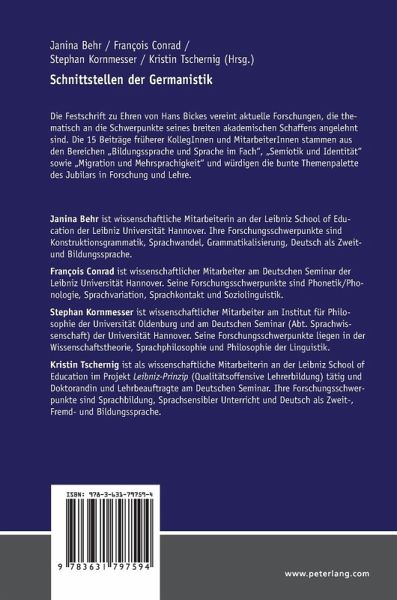 Janina Behr ist wissenschaftliche Mitarbeiterin an der Leibniz School of Education der Leibniz Universität Hannover. Ihre Forschungsschwerpunkte sind Konstruktionsgrammatik, Sprachwandel, Grammatikalisierung, Deutsch als Zweit- und Bildungssprache. François Conrad ist wissenschaftlicher Mitarbeiter am Deutschen Seminar der Leibniz Universität Hannover. Seine Forschungsschwerpunkte sind Phonetik/Phonologie, Sprachvariation, Sprachkontakt und Soziolinguistik. Stephan Kornmesser ist wissenschaftlicher Mitarbeiter am Institut für Philosophie der Universität Oldenburg und am Deutschen Seminar (Abt. Sprachwissenschaft) der Universität Hannover. Seine Forschungsschwerpunkte liegen in der Wissenschaftstheorie, Sprachphilosophie und Philosophie der Linguistik. Kristin Tschernig ist als wissenschaftliche Mitarbeiterin an der Leibniz School of Education im Projekt Leibniz-Prinzip (Qualitätsoffensive Lehrerbildung) tätig und Doktorandin und Lehrbeauftragte am Deutschen Seminar. Ihre Forschungsschwerpunkte sind Sprachbildung, Sprachsensibler Unterricht und Deutsch als Zweit-, Fremd- und Bildungssprache.