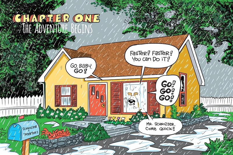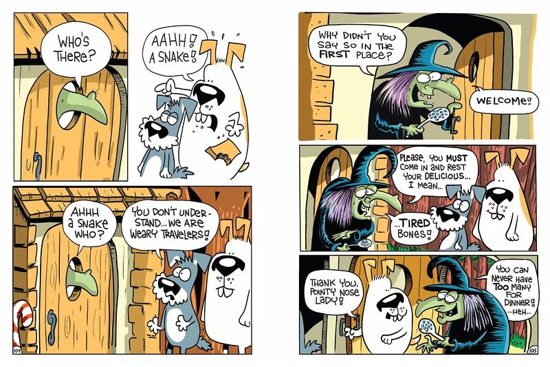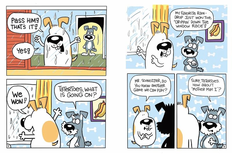Two best-friend dogs, Schnozzer (the smart one) and Tatertoes (the cheerful one), set off into the forest on a journey to visit Tatertoes's mom. Along their adventure, they encounter bees, bears, quicksand, characters from fairy tales, something called "nose spiders," and lots of yo-yo action. Their adventures are told as a series of vignettes, propelled by easygoing but giggle-inducing humor. That plus Rick Stromoski's lush, illustrative style and charming character designs make for page-turning, chuckle-filled reading.
