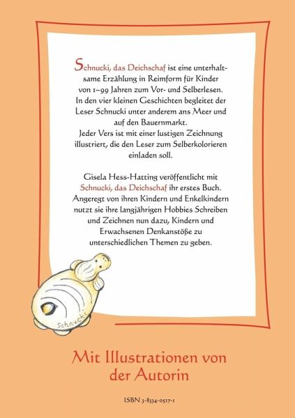 Schnucki, das Deichschaf ist eine unterhaltsame Erzählung in Reimform für Kinder und Erwachsene. Es ist ein Vorlese-, Lese- und Malbuch. In den vier kleinen Geschichten begleitet der Leser Schnucki unter anderem ans Meer und auf den Bauernmarkt. Jeder Vers ist mit einer lustigen Zeichnung illustriert. Gisela Hess-Hatting veröffentlicht mit Schnucki, das Deichschaf ihr erstes Buch. Angeregt durch Kinder und Enkelkinder nutzt sie ihre langjährigen Hobbies Schreiben und Zeichnen nun dazu, Kindern und Erwachsenen Denkanstöße zu unterschiedlichen Themen zu geben.