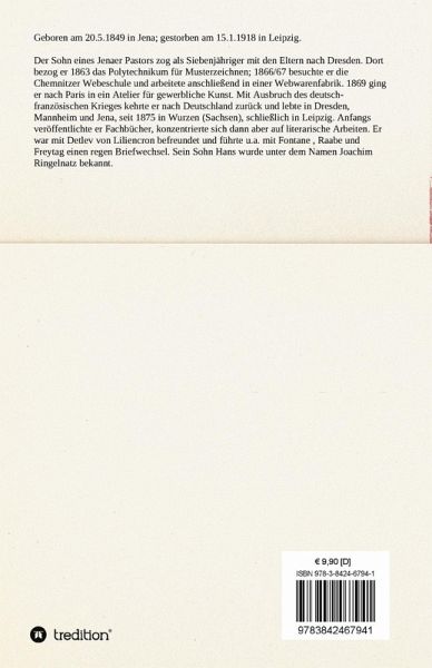 Geboren am 20.5.1849 in Jena; gestorben am 15.1.1918 in Leipzig. Der Sohn eines Jenaer Pastors zog als Siebenjähriger mit den Eltern nach Dresden. Dort bezog er 1863 das Polytechnikum für Musterzeichnen; 1866/67 besuchte er die Chemnitzer Webeschule und arbeitete anschließend in einer Webwarenfabrik. 1869 ging er nach Paris in ein Atelier für gewerbliche Kunst. Mit Ausbruch des deutsch-französischen Krieges kehrte er nach Deutschland zurück und lebte in Dresden, Mannheim und Jena, seit 1875 in Wurzen (Sachsen), schließlich in Leipzig. Anfangs veröffentlichte er Fachbücher, konzentrierte sich dann aber auf literarische Arbeiten. Er war mitDetlev von Liliencronbefreundet und führte u.a. mitFontane,RaabeundFreytageinen regen Briefwechsel. Sein Sohn Hans wurde unter dem NamenJoachim Ringelnatzbekannt.