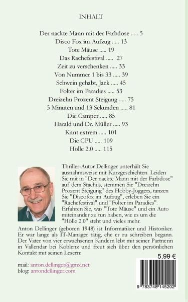 Ein Thriller-Autor unterhält Sie ausnahmsweise mit Kurzgeschichten. Leiden Sie mit in "Der nackte Mann mit der Farbdose" auf dem Stachus, stemmen Sie "Dreizehn Prozent Steigung" des Hobby-Joggers, tanzen Sie "Discofox im Aufzug", erleben Sie ein "Rachefestival", "Folter im Paradies" und die "Hölle 2.0". Erfahren Sie, was "Tote Mäuse" und ein Auto mit Gedankensteuerung miteinander zur tun haben, und noch vieles mehr.