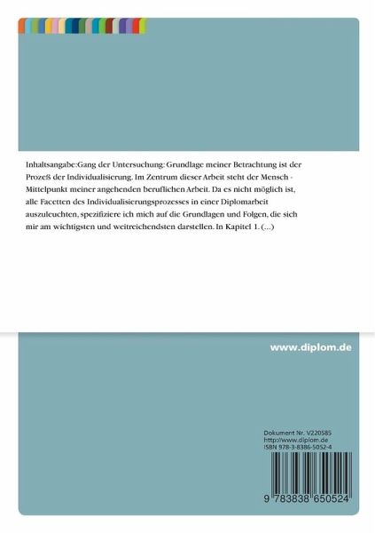 Grundlage meiner Betrachtung ist der Prozeß der Individualisierung. Im Zentrum dieser Arbeit steht der Mensch - Mittelpunkt meiner angehenden beruflichen Arbeit. Da es nicht möglich ist, alle Facetten des Individualisierungsprozesses in einer Diplomarbeit auszuleuchten, spezifiziere ich mich auf die Grundlagen und Folgen, die sich mir am wichtigsten und weitreichendsten darstellen. In Kapitel 1.1 gebe ich einen ersten Überblick über Tendenzen einer individualisierten Gesellschaft. Außerdem grenze ich Individualisierung vom Modernisierungsprozeß anhand eines idealtypischen Dreiecksmodell, in Anlehnung an Talcott Parsons idealtypischen Vierecksmodell, ab. Dieser Schritt wird nötig, da ich nicht den ganzen Modernisierungsprozeß bearbeiten will, sondern mich auf Individualisierung beschränke.Ich stellte fest, daß die anderen beiden Dimensionen von Parsons Modell, Rationalisierung und Differenzierung, zugleich Grundlage vom Individualisierungsprozeß sind, die sich gegenseitig bedingen. Dementsprechend gehe ich auf diese beiden Dimensionen gesondert ein und forme daraus das idealtypische Dreiecksmodell mit den Dimensionen Rationalisierung, Differenzierung und Individualisierung, als Grundlage meiner Arbeit.