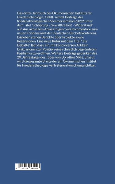 Das dritte Jahrbuch des Ökumenischen Instituts für Friedenstheologie, OekIF, nimmt Beiträge des friedenstheologischen Sommerseminars 2022 unter dem Titel "Schöpfung - Gewaltfreiheit - Widerstand" auf. Aus aktuellem Anlass folgen zwei Kommentare zum neuen Friedenswort der Deutschen Bischofskonferenz. Daneben stehen Berichte über Projekte sowie Rezensionen. Eine neue Rubik mit dem Titel "Zur Debatte" lädt dazu ein, mit kontroversen Artikeln Diskussionen zur Position eines christlich begründeten Pazifismus zu eröffnen. Weitere Beiträge gedenken des 20. Jahrestages des Todes von Dorothee Sölle. Erneut wird die gesamte Breite der am Ökumenischen Institut für Friedenstheologie vertretenen Forschung sichtbar.
