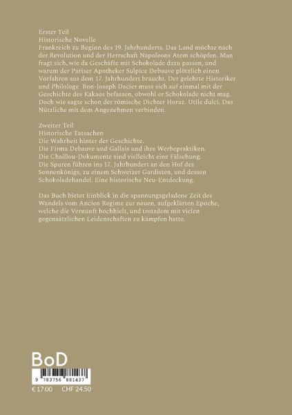 Erster Teil Historische NovelleFrankreich zu Beginn des 19. Jahrhunderts. Das Land möchte nach der Revolution und der Herrschaft Napoleons Atem schöpfen. Man fragt sich, wie da Geschäfte mit Schokolade dazu passen, und warum der Pariser Apotheker Sulpice Debauve plötzlich einen Vorfahren aus dem 17. Jahrhundert braucht. Der gelehrte Historiker und Philologe Bon-Joseph Dacier muss sich auf einmal mit der Geschichte des Kakaos befassen, obwohl er Schokolade nicht mag.Fantasie und Fakten, Geschäft und Interessenkonflikte. Doch wie sagte schon der römische Dichter Horaz. Utile dulci. Das Nützliche mit dem Angenehmen verbinden.Zweiter Teil Historische TatsachenDie Wahrheit hinter der Geschichte.Die Firma Debauve und Gallais und ihre Werbepraktiken.Die Chaillou-Dokumente sind vielleicht eine Fälschung.Die Spuren führen ins 17. Jahrhundert an den Hof des Sonnenkönigs, zu einem Schweizer Gardisten, und dessen Schokoladehandel. Eine historische Neu-Entdeckung.Das Buch bietet Einblick in die spannungsgeladene Zeit des Wandels vom Ancien Regime zur neuen, aufgeklärten Epoche, welche die Vernunft hochhielt, und trotzdem mit vielen gegensätzlichen Leidenschaften zu kämpfen hatte.