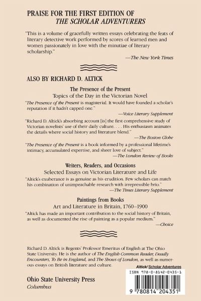"A carefully detailed but by no means dull account of the more dignified pursuit of detection as practiced by literary scholars." --Kirkus Reviews "Although [Altick' sensibly mentions that research may be a misadventure, he naturally enough plays up its glamour and romance; and its fascination for the scholar is transmitted to the reader. His book, then, as popular reading is first-rate, solid, rewarding, and lively" --The Nation "a brisk, well-written book" --Time "This is a volume of gracefully written essays celebrating the feats of literary detective work performed by scores of learned men and women passionately in love with the minutiae of literary scholarships." --The New York Times "a more fascinating recital than any fictional mystery story, and its detectives are, it leads us to believe, more interesting in themselves--they are not mousy researchers--than fictional private eyes" --The Boston Globe Richard Altick's classic portrayal of scholars on the prowl has delighted generations of readers. From the exposure of British rare book dealer Thomas Wise--the most famous authority of his day--as a master forger of first editions to the discovery of thousands of new James Boswell papers, Altick shows the scholar at work. Chaucer, Shakespeare, Wordsworth, Shelley, Keats, and many others surrender previously unrevealed secrets to these dogged researchers, whose ceaseless sleuthing has increased our knowledge and appreciation of both literature and the people who created it. Richard D. Altick is Regent's Professor Emeritus of English at The Ohio State University. He is the author of The English Common Reader, Lives and Letters, To Be in England, Victorian Studies in Scarlet, Victorian People and Ideas, The Shows of London, Paintings from Books, and Deadly Encounters as well as numerous essays on English literature and culture.