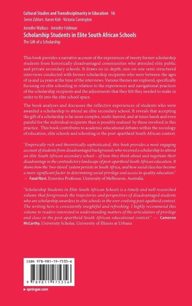 "Wallace and Feldman make a valuable contribution to understandings of marginalized students in exceptional circumstances, which will make educators think again about their students and the challenges they face. ... Scholarship Students in Elite South African Schools: The Gift of a Scholarship by Jennifer Wallace and Jennifer Feldman provides fascinating insights into the experiences of underprivileged Black students who secured scholarships ... . I found the book engaging, timely and well written." (George Variyan, Karen Lillie, and Aline Courtois, Discourse - Studies in the Cultural Politics of Education, May 10, 2023)