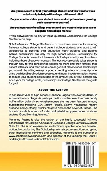 Are you a current college student and you want to win a scholarship to help with college tuition and bills? Do you want to shrink your student loans and stop them from growing each semester or quarter? Are you a parent of a college student and you want to help your son or daughter find college money? If you answered yes to any of these questions, Scholarships for College Students can help! Scholarships for College Students is a must-have resource for entering first-year college students and current college students who want to win scholarships to continue their education. Many students and parents believe scholarships are only for high school seniors. Scholarships for College Students proves that there are scholarships for all types of students, including those already on campus. This easy-to-use guide takes students through how to find scholarships specific to them and their families, their current interests, and their future career goals. It also includes scholarships you can win by writing essays or poetry, creating videos on a smartphone, using traditional application processes, and more. If you're a student hoping to reduce your student loan burden or the amount you or your parents pay each year for college costs, Scholarships for College Students is the guide for you! Marianne Ragins, $400,000 scholarship winner and popular workshop leader helps you identify hundreds of funding sources. From achievement, need, and merit-based funding to monetary prizes you can win in contests, Scholarships for College Students can help you fund the college education of your dreams with free money for college.