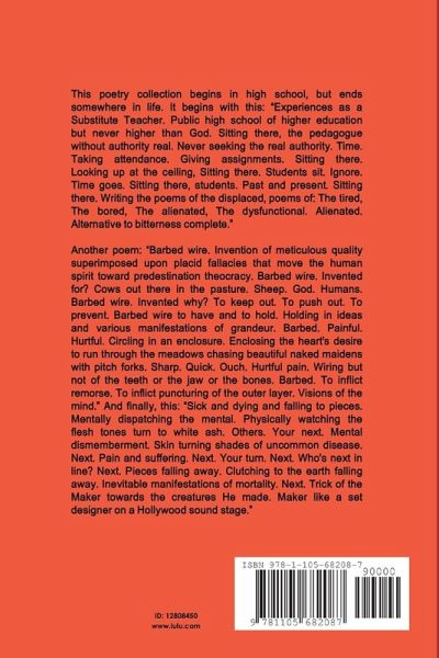 The collection begins in high school, but ends somewhere in life. We begin with this: "Experiences as a Substitute Teacher. Public high school of higher education but never higher than God. Sitting there, the pedagogue without authority real. Never seeking the real authority. Taking attendance. Giving assignments. Sitting there. Looking up at the ceiling, Sitting there. Students sit. Ignore. Time goes. Sitting there, students. Past and present. Sitting there. Writing the poems of the displaced, poems of: The tired, The bored, The alienated, The dysfunctional. Alienated." Another excerpt: "Barbed wire. Invention of meticulous quality superimposed upon placid fallacies that move the human spirit toward predestination theocracy. Barbed wire. Invented for? Cows out there in the pasture. Sheep. God. Humans. Barbed wire. Invented why? To keep out. To push out. To prevent. Barbed wire to have and to hold. Holding in ideas and various manifestations of grandeur. Barbed. Painful. Hurtful."