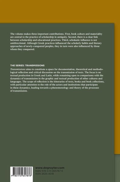 The purpose of this volume is to investigate scholastic culture in the Hellenistic and Roman eras, with a particular focus on ancient book and material culture as well as scholarship beyond Greek authors and the Greek language. Accordingly, one of the major contributions of this work is the inclusion of multiple perspectives and its contributors engage not only with elements of Greek scholastic culture, but also bring Greek ideas into conversation with developing Latin scholarship (see chapters by Dickey, Nicholls, Marshall) and the perspective of a minority culture (i.e., Jewish authors) (see chapters by Hezser, Adams). This multicultural perspective is an important next step in the discussion of ancient scholarship and this volume provides a starting point for future inquiries.