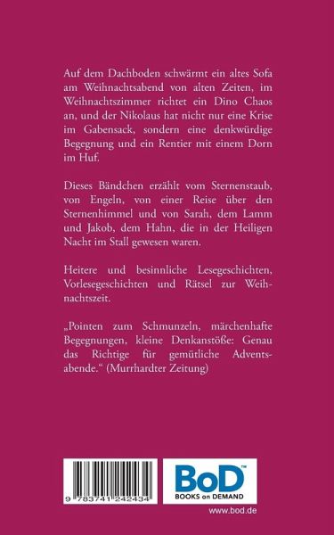 Auf dem Dachboden schwärmt ein altes Sofa am Weihnachtsabend von alten Zeiten, im Weihnachtszimmer richtet ein Dino Chaos an, und der Nikolaus hat nicht nur eine Krise im Gabensack, sondern eine denkwürdige Begegnung und ein Rentier mit einem Dorn im Huf.Dieses Bändchen erzählt vom Sternenstaub, von Engeln, von einer Reise über den Sternenhimmel und von Sarah, dem Lamm und Jakob, dem Hahn, die in der Heiligen Nacht im Stall gewesen waren.Heitere und besinnliche Lesegeschichten, Vorlesegeschichten und Rätsel zur Weihnachtszeit."Pointen zum Schmunzeln, märchenhafte Begegnungen, kleine Denkanstöße: Genau das Richtige für gemütliche Adventsabende." (Murrhardter Zeitung)