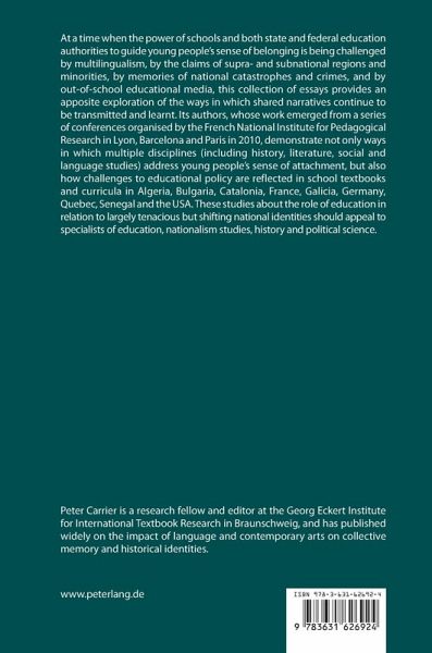 At a time when the power of schools and both state and federal education authorities to guide young people's sense of belonging is being challenged by multilingualism, by the claims of supra- and subnational regions and minorities, by memories of national catastrophes and crimes, and by out-of-school educational media, this collection of essays provides an apposite exploration of the ways in which shared narratives continue to be transmitted and learnt. Its authors, whose work emerged from a series of conferences organised by the French National Institute for Pedagogical Research in Lyon, Barcelona and Paris in 2010, demonstrate not only ways in which multiple disciplines (including history, literature, social and language studies) address young people's sense of attachment, but also how challenges to educational policy are reflected in school textbooks and curricula in Algeria, Bulgaria, Catalonia, France, Galicia, Germany, Quebec, Senegal and the USA. These studies about the role of education in relation to largely tenacious but shifting national identities should appeal to specialists of education, nationalism studies, history and political science.