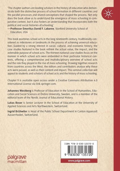 This book examines school acts in the long nineteenth century, traditionally considered as milestones or landmarks in the process of achieving universal education. Guided by a strong interest in social, cultural, and economic history, the case studies featured in the book rethink the actual value, the impact, and the ostensible purpose of school acts. The thirteen national case studies focus on the manner in which school acts were embedded in their particular historical contexts, offering a comprehensive and multidisciplinary overview of school acts and the role they played in the rise of mass schooling. Drawing together research from countries across the West, the editors and contributors analyse why these acts were passed, as well as their content and impact. This seminal collection will appeal to students and scholars of school acts and the history of mass schooling.
