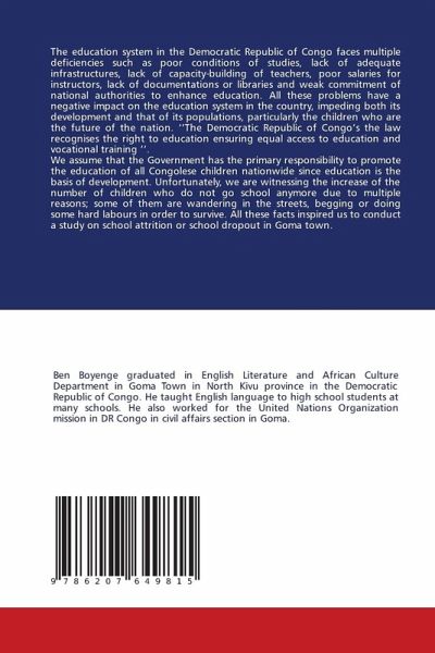 The education system in the Democratic Republic of Congo faces multiple deficiencies such as poor conditions of studies, lack of adequate infrastructures, lack of capacity-building of teachers, poor salaries for instructors, lack of documentations or libraries and weak commitment of national authorities to enhance education. All these problems have a negative impact on the education system in the country, impeding both its development and that of its populations, particularly the children who are the future of the nation. ''The Democratic Republic of Congo's the law recognises the right to education ensuring equal access to education and vocational training ''. We assume that the Government has the primary responsibility to promote the education of all Congolese children nationwide since education is the basis of development. Unfortunately, we are witnessing the increase of the number of children who do not go school anymore due to multiple reasons; some of them are wandering in the streets, begging or doing some hard labours in order to survive. All these facts inspired us to conduct a study on school attrition or school dropout in Goma town.