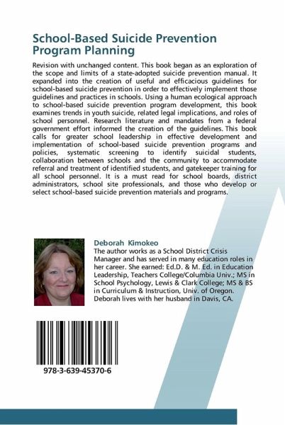 Revision with unchanged content. This book began as an exploration of the scope and limits of a state-adopted suicide prevention manual. It expanded into the creation of useful and efficacious guidelines for school-based suicide prevention in order to effectively implement those guidelines and practices in schools. Using a human ecological approach to school-based suicide prevention program development, this book examines trends in youth suicide, related legal implications, and roles of school personnel. Research literature and mandates from a federal government effort informed the creation of the guidelines. This book calls for greater school leadership in effective development and implementation of school-based suicide prevention programs and policies, systematic screening to identify suicidal students, collaboration between schools and the community to accommodate referral and treatment of identified students, and gatekeeper training for all school personnel. It is a must readfor school boards, district administrators, school site professionals, and those who develop or select school-based suicide prevention materials and programs.