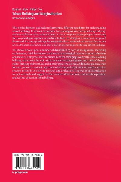 This book addresses, and seeks to harmonise, different paradigms for understanding school bullying. It sets out to examine two paradigms for conceptualising bullying, and the worldviews that underpin them. It uses a complex systems perspective to bring the two paradigms together in a holistic fashion. By doing so, it creates an integrated framework for conceptualising the many individual, relational and societal factors that are in dynamic interaction and play a part in promoting or reducing school bullying.