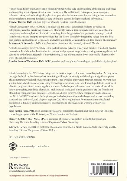 Sejal Parikh Foxx, PhD, is an associate professor of counselor education and the director of the school counseling program at the University of North Carolina at Charlotte. Stanley B. Baker, PhD, NCC, LPC, is professor of counselor education at North Carolina State University. He is the founding editor of Professional School Counseling. Edwin R. Gerler, Jr., EdD, is professor of counselor education at North Carolina State University and the founding editor of The Journal of School Violence.