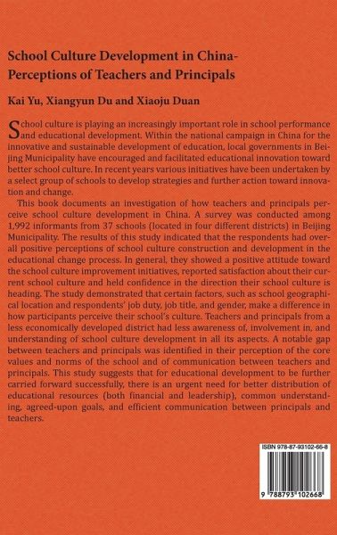School culture is playing an increasingly important role in school performance and educational development. Within the national campaign in China for the innovative and sustainable development of education, local governments in Beijing Municipality have encouraged and facilitated educational innovation toward better school culture. In recent years various initiatives have been undertaken by a select group of schools to develop strategies and further action toward innovation and change. This book documents an investigation of how teachers and principals perceive school culture development in China. A survey was conducted among 1,992 informants from 37 schools (located in four different districts) in Beijing Municipality. The results of this study indicated that the respondents had overall positive perceptions of school culture construction and development in the educational change process. In general, they showed a positive attitude toward the school culture improvement initiatives, reported satisfaction about their current school culture and held confidence in the direction their school culture is heading. The study demonstrated that certain factors, such as school geographical location and respondents' job duty, job title, and gender, make a difference in how participants perceive their school's culture. Teachers and principals from a less economically developed district had less awareness of, involvement in, and understanding of school culture development in all its aspects. A notable gap between teachers and principals was identified in their perception of the core values and norms of the school and of communication between teachers and principals. This study suggests that for educational development to be further carried forward successfully, there is an urgent need for better distribution of educational resources (both financial and leadership), common understanding, agreed-upon goals, and efficient communication between principals and teachers.