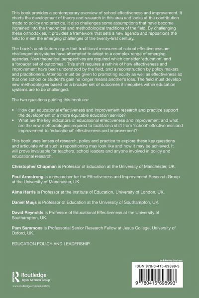 This book provides a contemporary overview of school effectiveness and improvement. It charts the development theory and research in this area and looks at the contribution made to policy and practice. It also challenges some assumptions that have become ingrained into the theoretical and methodological traditions of the field. By challenging these orthodoxies, it provides a framework that sets a new agenda and repositions the field to meet the emerging challenges of the twenty-first century. It argues that traditional measures of school effectiveness are challenged as systems have attempted to adapt to a complex range of emerging agendas. New theoretical perspectives are required which consider 'education' and a 'broader set of outcomes'. This shift requires a rethink of how effectiveness and improvement have been understood by the field, and a reconstruction by policy makers and practitioners. Attention must be given to promoting equity as well as effectiveness so that one school or student's gain no longer means another's loss. The field must develop new methodologies if inequities are to be challenged and a broader set of outcome measures are to be developed. The two questions guiding this book are: How can educational effectiveness and improvement research and practice support the development of a more equitable education service? What are the key indicators of educational effectiveness and improvement and what are the new methodologies required to facilitate a shift from 'school' effectiveness and improvement to 'educational' effectiveness and improvement? This book uses lenses of research, policy and practice to explore these key questions and articulate what such a repositioning may look like and how it may be achieved. It will prove invaluable for teachers, school leaders and anyone involved in policy and educational research.