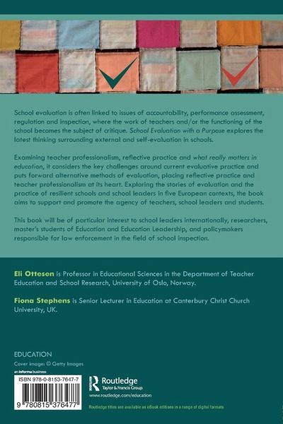 Chapter 1 Introduction; Chapter 2 School Evaluation trends and directions; Chapter 3 Values based evaluation: the experiences of two schools in England; Chapter 4 Exploring a journey in school evaluation: a Spanish secondary school; Chapter 5 A tangled tale? Teachers making sense of school evaluation in The Republic of Ireland; Chapter 6 Working against the grain: a values based school in Norway; Chapter 7 Lost in translation: challenges in educational evaluation in Poland; Chapter 8 What can case studies tell us about evaluation and assessment?; Chapter 9 Reflective practice, its role in evaluation and challenges for teacher professionalism.; Chapter 10 Evaluation with a purpose