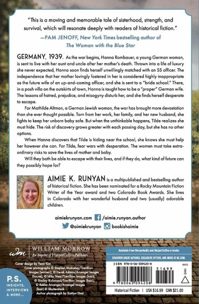 "The School for German Brides is a fascinating deep-dive into the German home front during World War II. Aimie K. Runyan deftly paints the details of Nazi-run Berlin through the eyes of two lovable heroines destined to cross paths at one of the Fuhrer's sinister Bride Schools: independent Hanna, fighting her engagement to a high-profile SS officer tooth and nail; and Tilde, a resourceful Jewish dressmaker struggling simply to survive. Moving, unsettling, unforgettable!" - Kate Quinn, New York Times bestselling author of The Diamond Eye