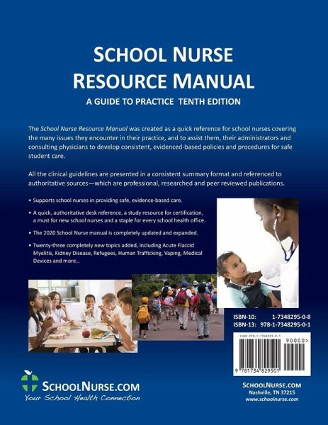 The School Nurse Resource Manual Tenth Edition was created as a quick reference for school nurses covering the many issues they encounter in their practice, and to assist them, their administrators and consulting physicians to develop consistent, evidenced-based policies and procedures for safe student care. All the clinical guidelines are presented in a consistent summary format and referenced to authoritative sources---which are professional, researched and peer reviewed publications. Supports school nurses in providing safe, evidence-based care. A quick, authoritative desk reference, as a study resource for certification.. A must for new school nurses and a staple for every school health office. The 2021 School Nurse manual is completely updated and expanded. Twenty-three completely new topics added, including Acute Flaccid Myelitis, Kidney Disease, Refugees, Human Trafficking, Vaping, Medical Devices and more…
