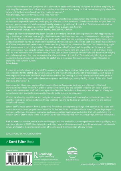 A powerful school culture can unite staff, shape positive behaviours, and create conditions for the staff body to work as one. This book explores how schools can develop a culture where individuals take pride in their work and actively seek and embrace development, seeing the big picture of the school and cherishing their role in it.