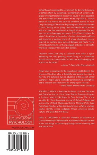 «Rochelle Brock and Greg S. Goodman have done it again: addressing the most pressing issues facing us in education! School Sucks! is a must-read for all who care about changing education for the better!» (Karen T. Carey, CSU Channel Islands) «Never ones to acquiesce to the educational establishment, Drs. Brock and Goodman offer a thoughtful and poignant critique in their raw and authentic style as educators of the people! School Sucks! will inspire you to reconsider commonly held assumptions and to consider new alternatives for changing our schools!» (David Weber, Fresno Pacific University)