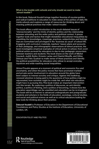 What is the trouble with schools and why should we want to make 'school trouble'? Schooling is implicated in the making of educational and social exclusions and inequalities as well as the making of particular sorts of students and teachers. For this reason schools are important sites of counter- or radical- politics. In this book, Deborah Youdell brings together theories of counter-politics and radical traditions in education to make sense of the politics of daily life inside schools and explores a range of resources for thinking about and enacting political practices that make 'school trouble'. The book offers a solid introduction to the much-debated issues of 'intersectionality' and the limits of identity politics and the relationship between schooling and the wider policy and political context. It pieces together a series of tools and tactics that might destabilize educational inequalities by unsettling the knowledges, meanings, practices, subjectivities and feelings that are normalized and privileged in the 'business as usual' of school life. Engaging with curriculum materials, teachers' lesson plans and accounts of their pedagogy, and ethnographic observations of school practices, the book investigates a range of empirical examples of critical action in school, from overt political action pursued by educators to day-to-day pedagogic encounters between teachers and students. The book draws on the work of Michel Foucault, Judith Butler, Ernesto Laclau and Chantel Mouffe, and Gilles Deleuze and Felix Guattari to make sense of these practices and identify the political possibilities for educators who refuse to accept the everyday injustices and wide-reaching social inequalities that face us. School Trouble appears at a moment of political and economic flux and uncertainty, and when the policy moves that have promoted markets and private sector involvement in education around the globe have been subject to intense scrutiny and critique. Against this backdrop, renewed attention is being paid to the questions of how politics might be rejuvenated, how societies might be made fair, and what role education might have in pursing this. This book makes an important intervention into this terrain. By exploring a politics of discourse, an anti-identity politics, a politics of feeling, and a politics of becoming, it shows how the education assemblage can be unsettled and education can be re-imagined. The book will be of interest to advanced undergraduate and postgraduate students and scholars in the fields of education, sociology, cultural studies, and social and political science as well as to critical educators looking for new tools for thinking about their practice.