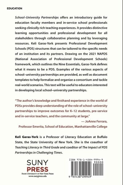 A research-based, practical guide to the Professional Development Schools (PDS) approach to school-university partnerships School-University Partnerships offers an introductory guide for education faculty members and in-service school professionals seeking clinically rich teaching experiences. It provides distinctive learning opportunities and professional development for all stakeholders through collaborative planning and by leveraging resources. Keli Garas-York presents Professional Development Schools (PDS) structures that can be tailored to the specific needs of an institution and its partners. Drawing on the 2021 NAPDS (National Association of Professional Development Schools) framework, which outlines the Nine Essentials, Garas-York defines what it means to be a PDS. Examples of the various aspects of school-university partnerships are provided, as well as document templates to help formalize and organize a consortium and tackle real-world scenarios. This text will be useful to educators interested in developing local school-university partnerships.