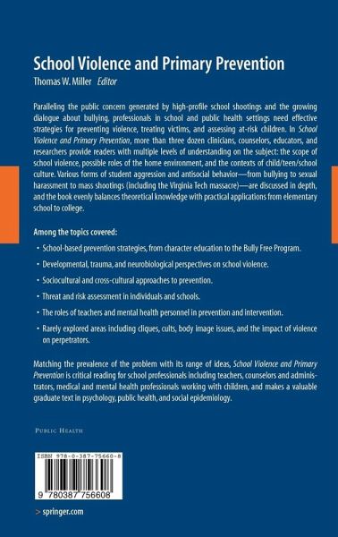 Despite the public alarm following several high-profile school shootings that occurred in the United States over the past decade, little is known about the actual incidence and characteristics of school-associated violence. School Violence and Primary Prevention grew out of a recent special issue of the Journal of Primary Prevention, which Thomas W. Miller guest edited. Understanding violence and reducing injury and death associated with violence is now, unfortunately, a major public health concern and is now a major objective of the Healthy People 2010 initiative.
