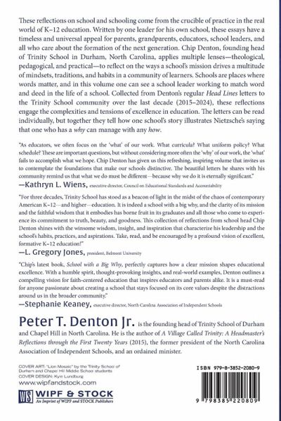 These reflections on school and schooling come from the crucible of practice in the real world of K-12 education. Written by a school leader for his school, these essays have a timeless and universal appeal for parents, grandparents, educators, school leaders, and all who care about the formation of the next generation. Chip Denton, founding head of Trinity School in Durham, North Carolina, applies multiple lenses--theological, pedagogical, and practical--to reflect on the ways a school's mission drives a multitude of mindsets, traditions, and habits in a community of learners. Schools are places where words matter, and in this volume you can see a school leader working to match word and deed in the life of a school. Collected from Denton's regular Head Lines letters to the Trinity School community over the last decade (2015-2024), these reflections engage the complexities and tensions of excellence in education. The letters can be read individually, but together they tell how one school's story illustrates Nietzsche's saying that one who has a why can manage with any how.