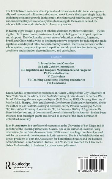 The link between economic development and education in Latin America is generally well-recognized. A literate and educated work force is the largest single factor in explaining economic growth. In this study, the editors and contributors survey the various elementary educational systems to investigate the reasons behind the failure of schools to retain students in elementary grades. A group of scholars looks at the current state of education in four countries: Mexico, Argentina, Brazil, and Chile, with a view to designing more effective programs for reducing the dropout and grade repetition rates. For each country studied, there is an overview of the school system, teacher training and attitudes, centralized and decentralized planning, curriculum development, and psychological and environmental issues that contribute to school dropout.