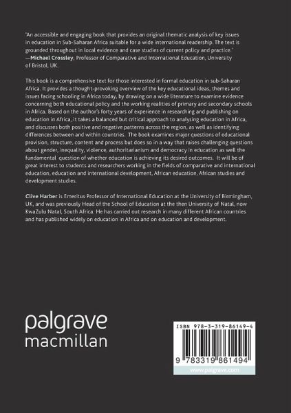 This book is a comprehensive text for those interested in formal education in sub-Saharan Africa. It provides a thought-provoking overview of the key educational ideas, themes and issues facing schooling in Africa today, by drawing on a wide literature to examine evidence concerning both educational policy and the working realities of primary and secondary schools in Africa. Based on the author's forty years of experience in researching and publishing on education in Africa, it takes a balanced but critical approach to analysing education in Africa, and discusses both positive and negative patterns across the region, as well as identifying differences between and within countries. The book examines major questions of educational provision, structure, content and process but does so in a way that raises challenging questions about gender, inequality, violence, authoritarianism and democracy in education as well the fundamental question of whether education is achieving its desiredoutcomes. It will be of great interest to students and researchers working in the fields of comparative and international education, education and international development, African education, African studies and development studies.