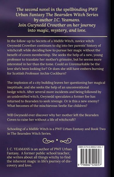 The second novel in the spellbinding Paranormal Women's Fiction Urban Fantasy, The Bearsden Witch Series by author J.C. Yeamans. Join Gwynedd Crowther on her journey into magic, mystery, and love. In the follow-up to Secrets of a Midlife Witch, novice witch Gwynedd Crowther continues to dig into her parents' history of witchcraft while deciding how to pursue her magic without the benefit of coven membership. She seeks the help of a new young professor to translate her mother's grimoire, but he seems more interested in her than the tome. Could an Unremarkable be the love she's been looking for? Or does she still have embers burning for Scottish Professor Archie Cockburn? The implosion of a city building leaves her questioning her magical ineptitude, and she seeks the help of an unconventional hedge witch. After several more incidences and being followed by an unidentified witch, Gwynedd speculates a former foe has returned to Bearsden to seek revenge. Or is this a new enemy? What becomes of the mischievous Seelie Fae children? Will Gwynedd ever discover why her mother left the Bearsden Coven to raise her without a life of witchcraft?