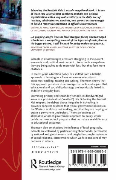 'A truly exceptional book.' - Michael W. Apple, University of Wisconsin, Madison 'A gripping insight into the local struggles facing disadvantaged schools and a compelling account of the injustice of their place in the bigger picture.' - Professor Geoff Whitty, Director, Institute of Education, University of London Schools in disadvantaged areas are struggling in the current economic and political environment. Like schools everywhere they are being asked to do more with less, but they face more obstacles. In recent years education policy has shifted from a holistic approach to learning to a focus on narrow educational outcomes: spelling, reading and writing. Thomson shows that this approach penalises disadvantaged schools and argues that educational and social disadvantage are inextricably linked in children's everyday lives. Examining primary and secondary schools in disadvantaged areas in a post-industrial ('rustbelt') city, Schooling the Rustbelt Kids reopens the debate about inequality in schooling. It provides concrete evidence that typical government policies in the Western world are not working, and that they are helping to create a permanent underclass. Thomson outlines an alternative whole of government approach to policy, which builds on those school programs that do make a real difference to educational outcomes. Thomson also emphasises the influence of local geography. Schools are coloured by particular neighbourhoods, permeated by national and global events, and tangled in complex networks of social relations. Interventions which work in one school may not work in others.