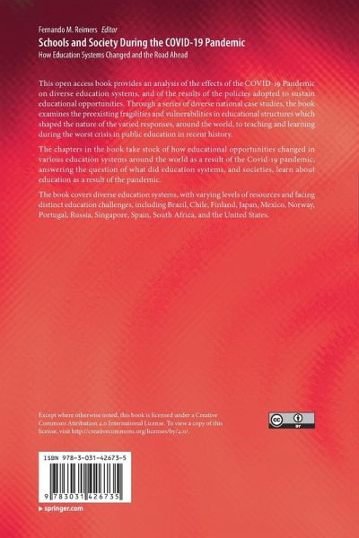 Chapter 1. From Loss to Hope. Paradoxical educational effects of the COVID-19 pandemic (Fernando M. Reimers).- Chapter 2. Brazil. How two municipalities achieved above-average results in reading in the early years of elementary school during the Covid-19 pandemic (Carlos Palacios, Alicia Bonamino).- Chapter 3. Post-pandemic crisis in Chilean education.The challenge of re-institutionalizing school education.(Cristián Bellei).- Chapter 4. The Switch toDistance Teaching and Learning in Finland During the COVID-19 Pandemic(2020-2022) Went Technically Well but was Emotionally Challenging (Katariina Salmela-Aro and Jari Lavonen).- Chapter 5. What Japan's education has lost and gained after almost succeeding in preventing the spread of infection and guaranteeing academic achievement (Kan Hiroshi).- Chapter 6. Understanding potential causes of learning loss in Mexico: Teachers´ perceptions regarding educational challenges during the COVID-19 pandemic (SergioCárdenas, Ignacio Ruelas, and Edson Sánchez).- Chapter 7. The Fragility of the Norwegian Policy Response: How Relying on Digital Infrastructure and Local Autonomy Led to an Increase in Inequality in Education(Marte Blikstad-Balas).- Chapter 8. Re-framing schools: what has been learned and remains in the post-covid period(Estela Costa & Mónica Baptista).- Chapter 9. Pandemic lessons: Story of cooperation and competition in Russian education(Anastasia A. Andreeva, Diana O. Koroleva, Sergei G. Kosaretsky, and Isaak D. Frumin).- Chapter 10. Singapore's endemic approach to education: Re-envisioning schools and learning(Oon Seng Tan, Jallene Jia En Chua).- Chapter 11. Reforming education in times of pandemic: The case of Spain(Alejandro Tiana-Ferrer).- Chapter 12. Fragility compounded: the state of the south african educational system in the aftermath of covid-19(Crain Soudien, Vijay Reddy and Jaqueline Harvey).- Chapter 13. Leaning into the Leapfrog Moment: Redesigning American Schools in a Post-Pandemic World(R. Lennon Audrain & Carole G. Basile).