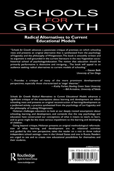 A passionate deconstruction and reconstruction of learning, development, and schooling that urges teachers to explore and create new educational opportunities for themselves and their students, Schools for Growth: Radical Alternatives to Current Educational Models asks the following questions: Can we create ways for people to learn the kinds of things that are necessary for functional adaptation without stifling their capacity to continuously create their growth? Can schools become environments that support children to perform not only as learners but as developers of their lives? This book challenges educators to look at the deeply-rooted assumptions about schooling, learning, and development and urges that the way psychology and education have constructed our conceptions of what it means to teach, to learn, and to grow may be the most serious impediment to the learning and developing of children. Beyond the criticism, the author presents an original methodological reformation of what learning and development are as relational activities and then takes readers on a visit to three radical independent school settings. Arguing that current educational models have been misguided by scientific psychology, the author states that the dominant model of human development actually hinders development. Moreover, as learning theory has become infused with developmental theory over the past 30 years, the overly cognitive manner in which psychologists have come to think about thinking, learning, and development has become further insinuated into education. Both theories--learning and developmental--fail o recognize the human capacity for relational-revolutionary activity and for performance. The prevalent mode of education--acquisitional learning--is grounded in a world view that gives primacy to knowledge and knowing which Holzman believes is inconsistent with ongoing developmental activity. The author focuses on "developmental learning"--a social constructionist, activity-theoretic conception of development which includes a transformation and synthesis of Vygotsky and philosopher Ludwig Wittgenstein. She also discusses educational projects that are self-conscious attempts to break with key elements of modern epistemology and the dominant psychological paradigm as they are perpetrated in contemporary educational theory and practice. Their specific philosophies and practices highlight important methodological issues raised in the attempt to create "postmodern schools"--schools more concerned with growing than knowing.
