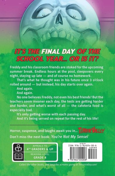 It's the final day of the school year... or is it? Freddy and his classroom friends are stoked for the upcoming summer break. Endless hours at the pool, sleepovers every night, staying up late - and of course no homework. That's what he thought was in his future once 3 o'clock rolled around - but instead, his day starts over again.And again.And again.No one believes Freddy, not even his best friends!But the teachers seem meaner each day, the tests are getting harder and harder, and what's worst of all - the cafeteria food is especially bad.It's only getting worse with each passing day.And it's being served on repeat for the rest of his life!
