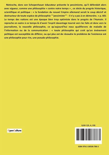 Nietzsche, dans son Schopenhauer éducateur présente le pessimisme, qu'il défendait alors avec vigueur, comme une philosophie « contre notre temps » , ce siècle du progrès historique, scientifique et politique : « la fondation du nouvel Empire allemand serait le coup décisif et destructeur de toute espèce de philosophie ""pessimiste"" - il n'y a pas à en démordre. » p. 601 Le temps des nations est une époque bien trop optimiste dans le progrès de l'Humain. Il reproche en outre à ce temps-là d'avoir l'esprit davantage tourné vers les faits et donc vers le journalisme, la nouvelle philosophie, ce qu'aujourd'hui nous qualifierons de maladie de l'information ou de la communication : « toute philosophie qui croit qu'un événement politique est susceptible de différer, ou qui plus est de résoudre le problème de l'existence est une philosophie pour rire, une pseudo-philosophie.