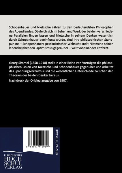 Georg Simmel (1858-1918) stellt in einer Reihe von Vorträgen die philosophischen Linien von Nietzsche und Schopenhauer gegenüber und arbeitet das Spannungsverhältnis und die wesentlichen Unterschiede zwischen den Theorien der beiden Denker heraus.