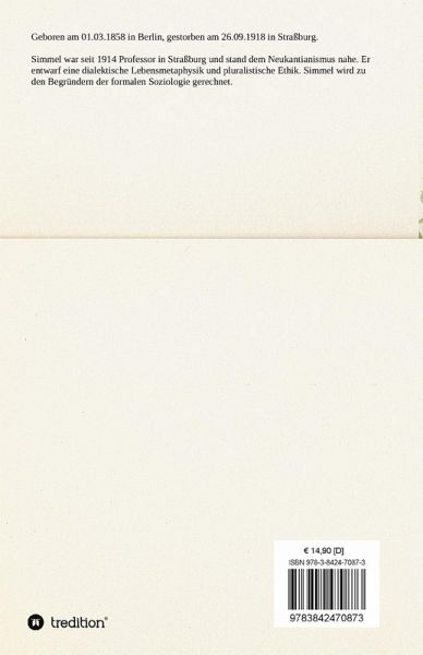 Geboren am 01.03.1858 in Berlin, gestorben am 26.09.1918 in Straßburg. Simmel war seit 1914 Professor in Straßburg und stand dem Neukantianismus nahe. Er entwarf eine dialektische Lebensmetaphysik und pluralistische Ethik. Simmel wird zu den Begründern der formalen Soziologie gerechnet.