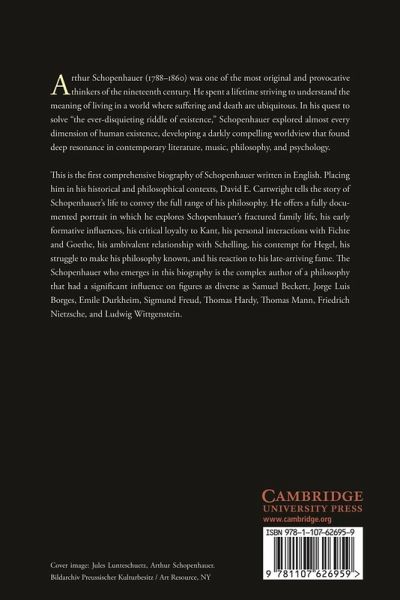 Cartwright tells the story of Schopenhauer's life to convey the full range of his philosophy, exploring Schopenhauer's fractured family life, his early formative influences, his critical loyalty to Kant, his personal interactions with Fichte and Goethe, his struggle to make his philosophy known, and his reaction to his late-arriving fame.