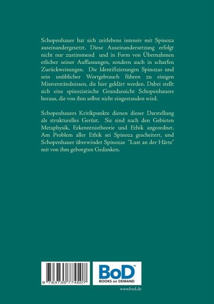 Schopenhauer hat sich zeitlebens intensiv mit Spinoza auseinandergesetzt. Diese Auseinandersetzung erfolgt nicht nur zustimmend und in Form von Übernahmen etlicher seiner Auffassungen, sondern auch in scharfen Zurückweisungen. Die Identifizierungen Spinozas und sein unüblicher Wortgebrauch führen zu einigen Missverständnissen, die hier geklärt werden. Dabei stellt sich eine spinozistische Grundansicht Schopenhauers heraus, die von ihm selbst nicht eingestanden wird.Schopenhauers Kritikpunkte dienen dieser Darstellung als strukturelles Gerüst. Sie sind nach den Gebieten Erkenntnistheorie, Metaphysik und Ethik angeordnet. Am Problem aller Ethik sei Spinoza gescheitert, und Schopenhauer überwindet die von Spinoza ausgeplauderte "Lust an der Härte" mit von ihm geborgten Gedanken.