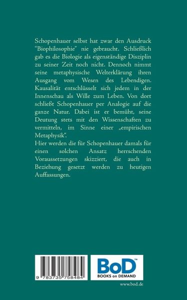 Schopenhauer selbst hat zwar den Ausdruck "Biophilosophie" nie gebraucht. Schließlich gab es die Biologie als eigenständige Disziplin zu seiner Zeit noch nicht. Dennoch nimmt seine metaphysische Welterklärung ihren Ausgang vom Wesen des Lebendigen. Kausalität entschlüsselt sich jedem in der Innenschau als Wille zum Leben. Von dort schließt Schopenhauer per Analogie auf die ganze Natur. Dabei ist er bemüht, seine Deutung stets mit den Wissenschaften zu vermitteln, im Sinne einer "empirischen Metaphysik".In diesem Buch werden die für Schopenhauer damals für einen solchen Ansatz herrschenden Voraussetzungen umrissen, die aber auch in Beziehung gesetzt werden zu heutigen Auffassungen.