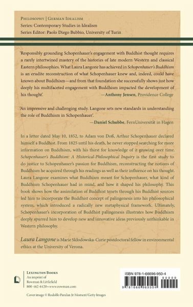 In a letter from May 10, 1852, to Adam von Doß, Arthur Schopenhauer declared himself to be a Buddhist. From 1825 until his death, he never stopped searching for more information on Buddhism, with his thirst for knowledge of it growing over time. Schopenhauer’s Buddhism: A Historical-Philosophical Inquiry is the first study to do justice to Schopenhauer’s passion for Buddhism, reconstructing the notions of Buddhism he acquired through his readings on Buddhism as well as their influence on his thought. Laura Langone examines what Buddhism meant for Schopenhauer, what kind of Buddhism Schopenhauer had in mind, and how Buddhism shaped his philosophy. This book examines how the assimilation of Buddhist tenets through his Buddhist sources led him to incorporate the Buddhist concept of palingenesis into his philosophical system, which introduced a radically new metaphysical framework. Ultimately, Schopenhauer’s incorporation of Buddhist palingenesis illustrates how Buddhism deeply spurred him to develop new and innovative ideas previously unthinkable in Western philosophy.