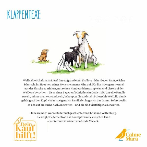Weil seine Schafmama Liesel ihn aufgrund einer Skoliose nicht säugen kann, wächst Schorschi im Haus von seiner Menschenmama Mira auf. Für ihn ist es ganz normal, aus der Flasche zu trinken, mit seinen Hundebrüdern zu spielen und Liesel auf der Weide zu besuchen - bis er eines Tages auf Minischwein Carla trifft. Um eine Familie zu sein, müsse man verwandt sein, behauptet die und stellt Schorschis Weltbild damit gehörig auf den Kopf. 'Was ist eigentlich Familie?', fragt sich das Lamm. Sofort begibt es sich auf die Suche nach Antworten - und die sind vielfältiger als erwartet. Eine ziemlich wahre Bilderbuchgeschichte von Christiane Wittenburg, die zeigt, wie farbenfroh das Konzept Familie aussehen kann - kunterbunt illustriert von Linda Mieleck. CalmeMara-Bücher tun Gutes: Mit dem Kauf dieses Buches unterstützt du die Tiere des Begegnungs- und Gnadenhofs Dorf Sentana und die sozialen Projekte vor Ort. CalmeMara-Bücher schützen die Umwelt: Dieses Buch wurde klimaneutralisiert, regional und vegan produziert.