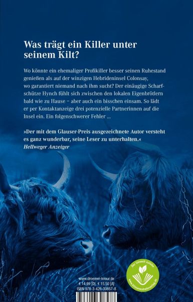 Wo könnte ein ehemaliger Profi-Killer besser seinen Ruhestand genießen, als auf der winzigen Hebriden-Insel Colonsay, wo garantiert niemand nach ihm sucht? Der einäugige Scharfschütze Hynch fühlt sich zwischen den einheimischen Eigenbrötlern bald wie zu Hause - aber auch ein bisschen einsam. Also gibt er eine Kontaktanzeige auf und lädt die drei vielversprechendsten Kandidatinnen auf die Insel ein. Dummerweise hat ihm in der Zwischenzeit auch ein Gangsterboss, mit dem er noch eine Rechnung offen hat, eine Killerin auf den Hals gehetzt. Ob Hochlandrind Thin Lizzy wohl weiß, welches von Hynchs Dates der Todesengel ist?
